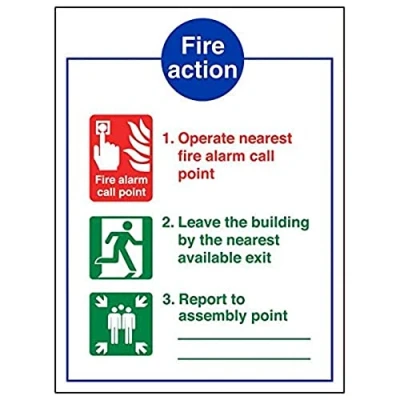 Provides essential information regarding action to be taken in the event of a fire Conforms to EN ISO 7010:2012 Portrait Orientation. Sign reads "Fire Action. Operate Nearest Fire Alarm Call Point. Leave The Building By The Nearest Available Exit. Report To Assembly Point" Highly durable Self Adhesive Vinyl material and screen printed message will stand the test of time Sign measures 150 x 200mm. Self Adhesive material will adhere securely to most surfaces