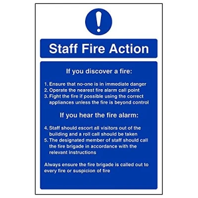 Provides essential information regarding action to be taken in the event of a fire Conforms to EN ISO 7010:2012 Portrait Orientation. Sign reads "Staff Fire Action. If You Discover A Fire: Ensure That No-One Is In Immediate Danger. Operate The Nearest Fire Alarm Call Point" Highly durable Self Adhesive Vinyl material and screen printed message will stand the test of time Sign measures 200 x 300mm. Self Adhesive material will adhere securely to most surfaces