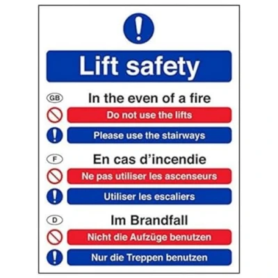 Provides essential information regarding action to be taken in the event of a fire Conforms to EN ISO 7010:2012 Portrait Orientation. Sign reads "Lift Safety. In The Event Of A Fire. Do Not Use The Lifts. Please Use The Stairways" Highly durable Self Adhesive Vinyl material and screen printed message will stand the test of time Sign measures 150 x 200mm. Self Adhesive material will adhere securely to most surfaces