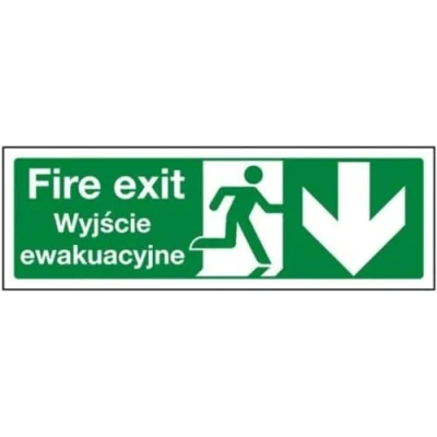 Sign Reads: Fire Exit Arrow Down - Wyjscie Ewakuacyjne Complies with BS 5499-2:1986 Fire safety signs, notices and graphic symbols Designed to identify escape routes in a fire emergency Should be fitted in a prominent location to aid fast and efficient evacuation Highly durable – made from durable self-adhesive flexible vinyl