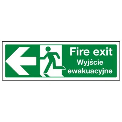 Sign Reads: Fire Exit Arrow Left - Wyjscie Ewakuacyjne Complies with BS 5499-2:1986 Fire safety signs, notices and graphic symbols Designed to identify escape routes in a fire emergency Should be fitted in a prominent location to aid fast and efficient evacuation Highly durable – made from durable self-adhesive flexible vinyl