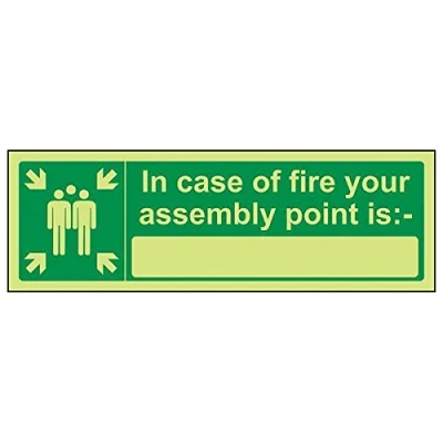 Helps to fulfil legal obligations to inform of the direction in which safety can be reached as per Health and Safety (Safety Signs & Signals) Regulations 1996 Conforms to EN ISO 7010:2012 by featuring a green background with a white pictogram or text positioned centrally Landscape Orientation. Sign reads "In Case Of Fire Your Assembly Point Is:" Highly durable Glow In The Dark 1mm plastic material and screen printed message will stand the test of time Sign measures 300 x 100mm.