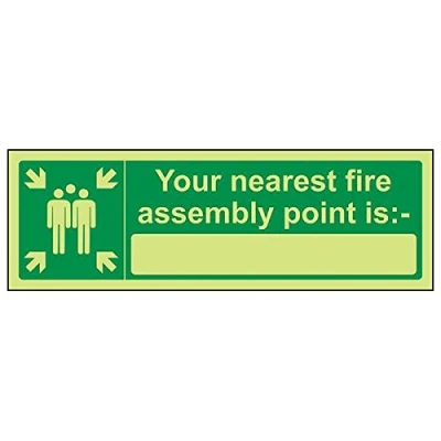 Helps to fulfil legal obligations to inform of the direction in which safety can be reached as per Health and Safety (Safety Signs & Signals) Regulations 1996 Conforms to EN ISO 7010:2012 by featuring a green background with a white pictogram or text positioned centrally Landscape Orientation. Sign reads "Your Nearest Fire Assembly Point Is" Highly durable Glow In The Dark 1mm plastic material and screen printed message will stand the test of time Sign measures 300 x 100mm.