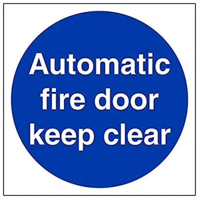 obligation helps to comply, Vital Escape Route Information on fire doors for all staff and visitors as per Health and Safety (Safety Signs & Signals) Regulations 1996 Conforms to EN ISO 7010 ISO: 2012 Square Alignment. Sign reads "Automatic" Fire Door Keep Clear Highly durable self-adhesive vinyl material and screen printed message will stand the test of time Sign measures 150mm x 150mm. Stick self-adhesive material will stick securely to most surfaces