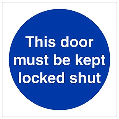 Helps to fulfil obligations to show vital escape route information about fire doors for all employees and visitors as per Health and Safety (Safety Signs & Signals) Regulations 1996 Conforms to EN ISO 7010:2012 Square Orientation. Sign reads "This Door Must Be Kept Locked Shut" Highly durable Self Adhesive Vinyl material and screen printed message will stand the test of time Sign measures 100 x 100mm. Self Adhesive material will adhere securely to most surfaces