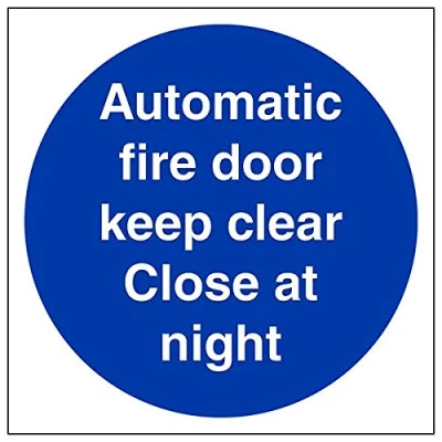 Helps to fulfil obligations to show vital escape route information about fire doors for all employees and visitors as per Health and Safety (Safety Signs & Signals) Regulations 1996 Conforms to EN ISO 7010:2012 Square Orientation. Sign reads "Automatic Fire Door Keep Clear. Close At Night" Highly durable 1mm plastic material and screen printed message will stand the test of time Sign measures 150 x 150mm.