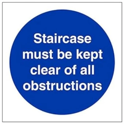 Helps to fulfil obligations to show vital escape route information about fire doors for all employees and visitors as per Health and Safety (Safety Signs & Signals) Regulations 1996 Conforms to EN ISO 7010:2012 Square Orientation. Sign reads "Staircase Must Be Kept Clear Of All Obstructions" Highly durable Self Adhesive Vinyl material and screen printed message will stand the test of time Sign measures 100 x 100mm. Self Adhesive material will adhere securely to most surfaces