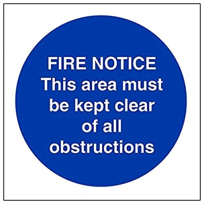 Helps to fulfil obligations to show vital escape route information about fire doors for all employees and visitors as per Health and Safety (Safety Signs & Signals) Regulations 1996 Conforms to EN ISO 7010:2012 Square Orientation. Sign reads "Fire Notice. This Area Must Be Kept Clear Of All Obstructions" Highly durable Self Adhesive Vinyl material and screen printed message will stand the test of time Sign measures 100 x 100mm. Self Adhesive material will adhere securely to most surfaces