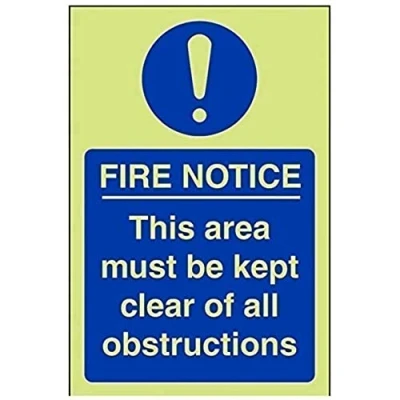 Helps to fulfil obligations to show vital escape route information about fire doors for all employees and visitors as per Health and Safety (Safety Signs & Signals) Regulations 1996 Conforms to EN ISO 7010:2012 Portrait Orientation. Sign reads "Fire Notice. This Area Must Be Kept Clear Of All Obstructions" Highly durable Glow In The Dark 1mm plastic material and screen printed message will stand the test of time Sign measures 100 x 150mm