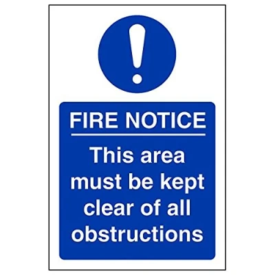 Helps to fulfil obligations to show vital escape route information about fire doors for all employees and visitors as per Health and Safety (Safety Signs & Signals) Regulations 1996 Conforms to EN ISO 7010:2012 Portrait Orientation. Sign reads "Fire Notice. This Area Must Be Kept Clear Of All Obstructions" Highly durable Self Adhesive Vinyl material and screen printed message will stand the test of time Sign measures 100 x 150mm. Self Adhesive material will adhere securely to most surfaces