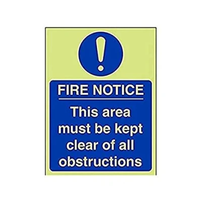 Helps to fulfil obligations to show vital escape route information about fire doors for all employees and visitors as per Health and Safety (Safety Signs & Signals) Regulations 1996 Conforms to EN ISO 7010:2012 Portrait Orientation. Sign reads "Fire Notice. This Area Must Be Kept Clear Of All Obstructions" Highly durable Glow In The Dark 1mm plastic material and screen printed message will stand the test of time Sign measures 150 x 200mm