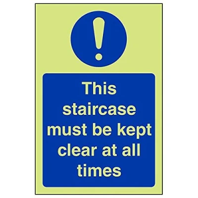 Helps to fulfil obligations to show vital escape route information about fire doors for all employees and visitors as per Health and Safety (Safety Signs & Signals) Regulations 1996 Conforms to EN ISO 7010:2012 Portrait Orientation. Sign reads "Staircase Must Be Kept Clear At All Times" Highly durable Glow In The Dark 1mm plastic material and screen printed message will stand the test of time Sign measures 100 x 150mm.