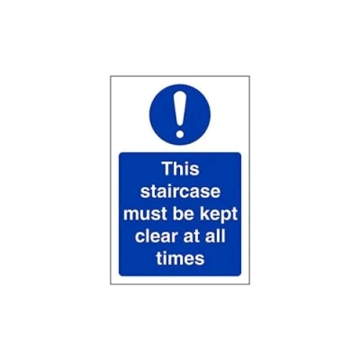 Helps to fulfil obligations to show vital escape route information about fire doors for all employees and visitors as per Health and Safety (Safety Signs & Signals) Regulations 1996 Conforms to EN ISO 7010:2012 Portrait Orientation. Sign reads "Staircase Must Be Kept Clear At All Times" Highly durable Self Adhesive Vinyl material and screen printed message will stand the test of time Sign measures 100 x 150mm. Self Adhesive material will adhere securely to most surfaces