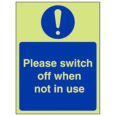 Helps to fulfil obligations to show vital escape route information about fire doors for all employees and visitors as per Health and Safety (Safety Signs & Signals) Regulations 1996 Conforms to EN ISO 7010:2012 Portrait Orientation. Sign reads "Please Switch Off When Not In Use" Highly durable Glow In The Dark 1mm plastic material and screen printed message will stand the test of time Sign measures 150 x 200mm.