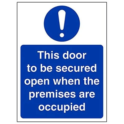 Helps to fulfil obligations to show vital escape route information about fire doors for all employees and visitors as per Health and Safety (Safety Signs & Signals) Regulations 1996 Conforms to EN ISO 7010:2012 Portrait Orientation. Sign reads "This Door To Be Secured Open When The Premises Are Occupied" Highly durable Self Adhesive Vinyl material and screen printed message will stand the test of time Sign measures 150 x 200mm. Self Adhesive material will adhere securely to most surfaces