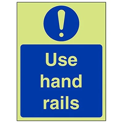 Helps to fulfil obligations to show vital escape route information about fire doors for all employees and visitors as per Health and Safety (Safety Signs & Signals) Regulations 1996 Conforms to EN ISO 7010:2012 Portrait Orientation. Sign reads "Use Hand Rails" Highly durable Glow In The Dark 1mm plastic material and screen printed message will stand the test of time Sign measures 150 x 200mm.
