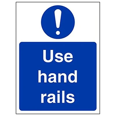 Helps to fulfil obligations to show vital escape route information about fire doors for all employees and visitors as per Health and Safety (Safety Signs & Signals) Regulations 1996 Conforms to EN ISO 7010:2012 Portrait Orientation. Sign reads "Use Hand Rails" Highly durable Self Adhesive Vinyl material and screen printed message will stand the test of time Sign measures 150 x 200mm. Self Adhesive material will adhere securely to most surfaces