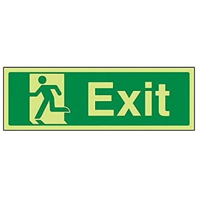 Helps to fulfil legal obligations to inform of the direction in which safety can be reached as per Health and Safety (Safety Signs & Signals) Regulations 1996 Conforms to EN ISO 7010:2012 by featuring a green background with a white pictogram or text positioned centrally Landscape Orientation. Sign reads "Exit" Highly durable Glow In The Dark 1mm plastic material and screen printed message will stand the test of time Sign measures 300 x 100mm.