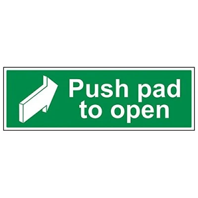 Helps to fulfil legal obligations to inform of the direction in which safety can be reached as per Health and Safety (Safety Signs & Signals) Regulations 1996 Conforms to EN ISO 7010:2012 by featuring a green background with a white pictogram or text positioned centrally Landscape Orientation. Sign reads "Push Pad To Open" Highly durable 1mm plastic material and screen printed message will stand the test of time Sign measures 600 x 200mm.