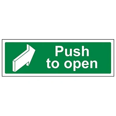 Helps to fulfil legal obligations to inform of the direction in which safety can be reached as per Health and Safety (Safety Signs & Signals) Regulations 1996 Conforms to EN ISO 7010:2012 by featuring a green background with a white pictogram or text positioned centrally Landscape Orientation. Sign reads "Push To Open" Highly durable 1mm plastic material and screen printed message will stand the test of time Sign measures 300 x 100mm.