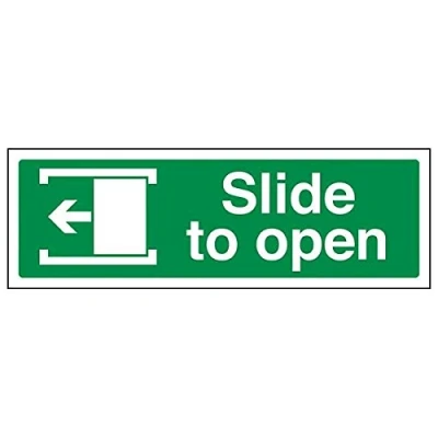 Helps to fulfil legal obligations to inform of the direction in which safety can be reached as per Health and Safety (Safety Signs & Signals) Regulations 1996 Conforms to EN ISO 7010:2012 by featuring a green background with a white pictogram or text positioned centrally Landscape Orientation. Sign reads "Slide To Open" Highly durable Self Adhesive Vinyl material and screen printed message will stand the test of time Sign measures 300 x 100mm. Self Adhesive material will adhere securely to most surfaces