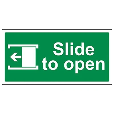 Helps to fulfil legal obligations to inform of the direction in which safety can be reached as per Health and Safety (Safety Signs & Signals) Regulations 1996 Conforms to EN ISO 7010:2012 by featuring a green background with a white pictogram or text positioned centrally Landscape Orientation. Sign reads "Slide To Open" Highly durable Self Adhesive Vinyl material and screen printed message will stand the test of time Sign measures 300 x 150mm. Self Adhesive material will adhere securely to most surfaces