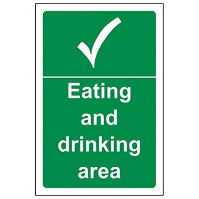 Helps to fulfil legal obligations to inform of the direction in which safety can be reached as per Health and Safety (Safety Signs & Signals) Regulations 1996 Conforms to EN ISO 7010:2012 by featuring a green background with a white pictogram or text positioned centrally Portrait Orientation. Sign reads "Eating and Drinking Area" Highly durable Self Adhesive Vinyl material and screen printed message will stand the test of time Sign measures 100 x 150mm. Self Adhesive material will adhere securely to most surfaces