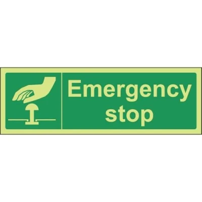 Helps to fulfil legal obligations to inform of the direction in which safety can be reached as per Health and Safety (Safety Signs & Signals) Regulations 1996 Conforms to EN ISO 7010:2012 by featuring a green background with a white pictogram or text positioned centrally Landscape Orientation. Sign reads "Emergency Stop" Highly durable Glow In The Dark 1mm plastic material and screen printed message will stand the test of time Sign measures 300 x 100mm.