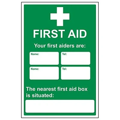 Helps to fulfil obligations to inform of where first aid supplies are kept as per First Aid At Work Regulations, as well as Health and Safety (Safety Signs & Signals) Regulations 1996 Conforms to EN ISO 7010:2012 Portrait Orientation. Sign reads "First Aid. Your First Aiders Are: The Nearest First Aid Box Is Situated:" Highly durable 1mm plastic material and screen printed message will stand the test of time Sign measures 400 x 600mm.