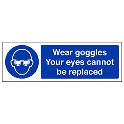 Helps to fulfil legal obligations to remind staff and visitors to wear the appropriate PPE when required to ensure personal safety as per Health and Safety (Safety Signs & Signals) Regulations 1996 Conforms to EN ISO 7010:2012 - Mandatory Signs feature a round symbol with a blue background of at least 50% of the total sign area, with a white pictogram and text Landscape Orientation. Sign reads "Wear Goggles. Your Eyes Cannot Be Replaced" Highly durable 1mm plastic material and screen printed message will stand the test of time Sign measures 300 x 100mm.