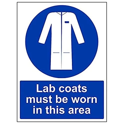 Helps to fulfil legal obligations to remind staff and visitors to wear the appropriate PPE when required to ensure personal safety as per Health and Safety (Safety Signs & Signals) Regulations 1996 Conforms to EN ISO 7010:2012 - Mandatory Signs feature a round symbol with a blue background of at least 50% of the total sign area, with a white pictogram and text Portrait Orientation. Sign reads "Lab Coats Must Be Worn In This Area" Highly durable 1mm plastic material and screen printed message will stand the test of time Sign measures 300 x 400mm.