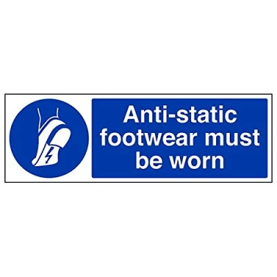 Helps to fulfil legal obligations to remind staff and visitors to wear the appropriate PPE when required to ensure personal safety as per Health and Safety (Safety Signs & Signals) Regulations 1996 Conforms to EN ISO 7010:2012 - Mandatory Signs feature a round symbol with a blue background of at least 50% of the total sign area, with a white pictogram and text Landscape Orientation. Sign reads "Anti-static Footwear Must Be Worn" Highly durable Self Adhesive Vinyl material and screen printed message will stand the test of time Sign measures 450 x 150mm. Self Adhesive material will adhere securely to most surfaces