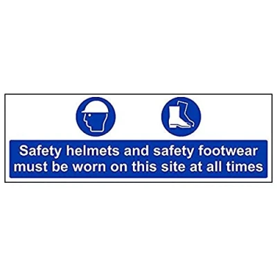 Helps to fulfil legal obligations to remind staff and visitors to wear the appropriate PPE when required to ensure personal safety as per Health and Safety (Safety Signs & Signals) Regulations 1996 Conforms to EN ISO 7010:2012 - Mandatory Signs feature a round symbol with a blue background of at least 50% of the total sign area, with a white pictogram and text Landscape Orientation. Sign reads "Safety Helmets and Safety Footwear Must Be Worn On This Site" Highly durable 1mm plastic material and screen printed message will stand the test of time Sign measures 450 x 150mm.