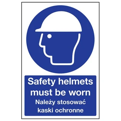Sign Reads: Safety Helmets Must Be Worn - Nalezy Stosowac Kaski Ochronne Ensures employees are fully aware of risks and hazards of using machinery Ensures employers comply with their responsibility to inform staff and promote good ear health Conforms to EN ISO 7010:2012 Highly durable - made from durable 1mm rigid plastic
