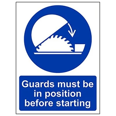 Helps to fulfil legal obligations to advise employees and visitors of specific actions and behaviour which must be adhered to in order to ensure personal safety as per Health and Safety (Safety Signs & Signals) Regulations 1996 Conforms to EN ISO 7010:2012 - Mandatory Signs feature a round symbol with a blue background of at least 50% of the total sign area, with a white pictogram and text Portrait Orientation. Sign reads "Guards Must Be In Position Before Starting" Highly durable 1mm plastic material and screen printed message will stand the test of time Sign measures 150 x 200mm.