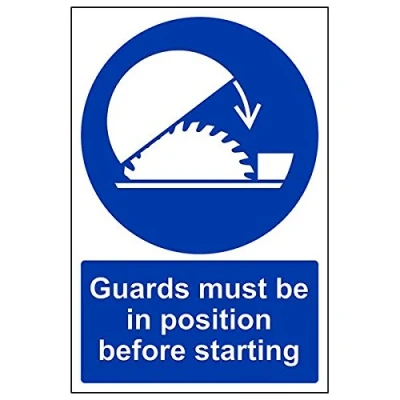 Helps to fulfil legal obligations to advise employees and visitors of specific actions and behaviour which must be adhered to in order to ensure personal safety as per Health and Safety (Safety Signs & Signals) Regulations 1996 Conforms to EN ISO 7010:2012 - Mandatory Signs feature a round symbol with a blue background of at least 50% of the total sign area, with a white pictogram and text Portrait Orientation. Sign reads "Guards Must Be In Position Before Starting" Highly durable 1mm plastic material and screen printed message will stand the test of time Sign measures 200 x 300mm.