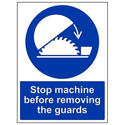 Helps to fulfil legal obligations to advise employees and visitors of specific actions and behaviour which must be adhered to in order to ensure personal safety as per Health and Safety (Safety Signs & Signals) Regulations 1996 Conforms to EN ISO 7010:2012 - Mandatory Signs feature a round symbol with a blue background of at least 50% of the total sign area, with a white pictogram and text Portrait Orientation. Sign reads "Stop Machine Before Removing The Guards" Highly durable Self Adhesive Vinyl material and screen printed message will stand the test of time Sign measures 300 x 400mm. Self Adhesive material will adhere securely to most surfaces