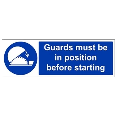 Helps to fulfil legal obligations to advise employees and visitors of specific actions and behaviour which must be adhered to in order to ensure personal safety as per Health and Safety (Safety Signs & Signals) Regulations 1996 Conforms to EN ISO 7010:2012 - Mandatory Signs feature a round symbol with a blue background of at least 50% of the total sign area, with a white pictogram and text Landscape Orientation. Sign reads "Guards Must Be In Position Before Starting" Highly durable 1mm plastic material and screen printed message will stand the test of time Sign measures 300 x 100mm.