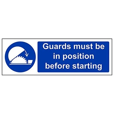 Helps to fulfil legal obligations to advise employees and visitors of specific actions and behaviour which must be adhered to in order to ensure personal safety as per Health and Safety (Safety Signs & Signals) Regulations 1996 Conforms to EN ISO 7010:2012 - Mandatory Signs feature a round symbol with a blue background of at least 50% of the total sign area, with a white pictogram and text Landscape Orientation. Sign reads "Guards Must Be In Position Before Starting" Highly durable Self Adhesive Vinyl material and screen printed message will stand the test of time Sign measures 300 x 100mm. Self Adhesive material will adhere securely to most surfaces