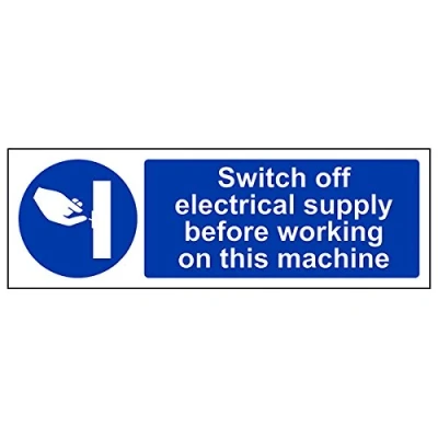 Helps to fulfil legal obligations to advise employees and visitors of specific actions and behaviour which must be adhered to in order to ensure personal safety as per Health and Safety (Safety Signs & Signals) Regulations 1996 Conforms to EN ISO 7010:2012 - Mandatory Signs feature a round symbol with a blue background of at least 50% of the total sign area, with a white pictogram and text Landscape Orientation. Sign reads "Switch Off Electricity Supply Before Working On This Machine" Highly durable Self Adhesive Vinyl material and screen printed message will stand the test of time Sign measures 300 x 100mm. Self Adhesive material will adhere securely to most surfaces