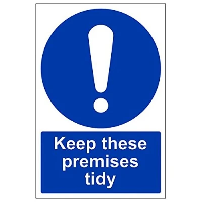 Helps to fulfil legal obligations to advise employees and visitors of specific actions and behaviour which must be adhered to in order to ensure personal safety as per Health and Safety (Safety Signs & Signals) Regulations 1996 Conforms to EN ISO 7010:2012 - Mandatory Signs feature a round symbol with a blue background of at least 50% of the total sign area, with a white pictogram and text Portrait Orientation. Sign reads "Keep These Premises Tidy" Highly durable 1mm plastic material and screen printed message will stand the test of time Sign measures 200 x 300mm.