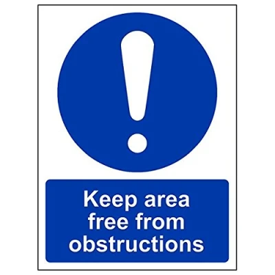 Helps to fulfil legal obligations to advise employees and visitors of specific actions and behaviour which must be adhered to in order to ensure personal safety as per Health and Safety (Safety Signs & Signals) Regulations 1996 Conforms to EN ISO 7010:2012 - Mandatory Signs feature a round symbol with a blue background of at least 50% of the total sign area, with a white pictogram and text Portrait Orientation. Sign reads "Keep Area Free From Obstructions" Highly durable Self Adhesive Vinyl material and screen printed message will stand the test of time Sign measures 150 x 200mm. Self Adhesive material will adhere securely to most surfaces