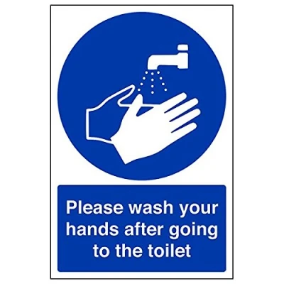 Helps to fulfil legal obligations to advise employees and visitors of specific actions and behaviour which must be adhered to in order to ensure personal safety as per Health and Safety (Safety Signs & Signals) Regulations 1996 Conforms to EN ISO 7010:2012 - Mandatory Signs feature a round symbol with a blue background of at least 50% of the total sign area, with a white pictogram and text Portrait Orientation. Sign reads "Please Wash Your Hands After Going To The Toilet" Highly durable Self Adhesive Vinyl material and screen printed message will stand the test of time Sign measures 200 x 300mm. Self Adhesive material will adhere securely to most surfaces