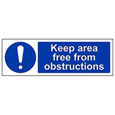 Helps to fulfil legal obligations to advise employees and visitors of specific actions and behaviour which must be adhered to in order to ensure personal safety as per Health and Safety (Safety Signs & Signals) Regulations 1996 Conforms to EN ISO 7010:2012 - Mandatory Signs feature a round symbol with a blue background of at least 50% of the total sign area, with a white pictogram and text Landscape Orientation. Sign reads "Keep Area Free From Obstructions" Highly durable 1mm plastic material and screen printed message will stand the test of time Sign measures 300 x 100mm.