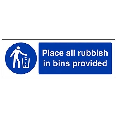 Helps to fulfil legal obligations to advise employees and visitors of specific actions and behaviour which must be adhered to in order to ensure personal safety as per Health and Safety (Safety Signs & Signals) Regulations 1996 Conforms to EN ISO 7010:2012 - Mandatory Signs feature a round symbol with a blue background of at least 50% of the total sign area, with a white pictogram and text Landscape Orientation. Sign reads "Place All Rubbish In Bins Provided" Highly durable Self Adhesive Vinyl material and screen printed message will stand the test of time Sign measures 300 x 100mm. Self Adhesive material will adhere securely to most surfaces