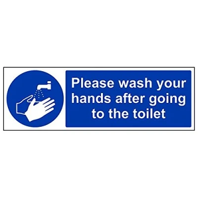 Helps to fulfil legal obligations to advise employees and visitors of specific actions and behaviour which must be adhered to in order to ensure personal safety as per Health and Safety (Safety Signs & Signals) Regulations 1996 Conforms to EN ISO 7010:2012 - Mandatory Signs feature a round symbol with a blue background of at least 50% of the total sign area, with a white pictogram and text Landscape Orientation. Sign reads "Please Wash Your Hands After Going To The Toilet" Highly durable Self Adhesive Vinyl material and screen printed message will stand the test of time Sign measures 450 x 150mm. Self Adhesive material will adhere securely to most surfaces