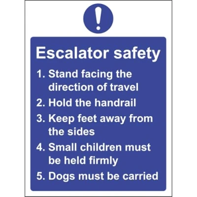 Helps to fulfil legal obligations to advise employees and visitors of specific actions and behaviour which must be adhered to in order to ensure personal safety as per Health and Safety (Safety Signs & Signals) Regulations 1996 Conforms to EN ISO 7010:2012 - Mandatory Signs feature a round symbol with a blue background of at least 50% of the total sign area, with a white pictogram and text Portrait Orientation. Sign reads "Escalator Safety. Stand Facing The Direction Of Travel. Hold The Handrail. Keep Feet Away From The Sides. Small Children Must Be Held Firmly. Dogs Must Be Carried" Highly durable 1mm plastic material and screen printed message will stand the test of time Sign measures 150 x 200mm.
