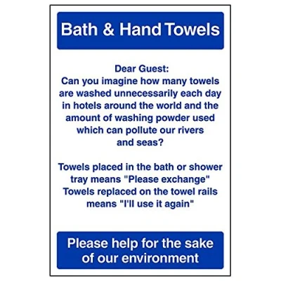Helps to fulfil legal obligations to advise employees and visitors of specific actions and behaviour which must be adhered to in order to ensure personal safety as per Health and Safety (Safety Signs & Signals) Regulations 1996 Conforms to EN ISO 7010:2012 - Mandatory Signs feature a round symbol with a blue background of at least 50% of the total sign area, with a white pictogram and text Portrait Orientation. Sign reads "Bath & Hand Towels. Towels Placed In The Bath or Shower Tray Means: Please Exchange. Towels Replaced On The Towel Rails Means: I'll Use It Again" Highly durable 1mm plastic material and screen printed message will stand the test of time Sign measures 200 x 300mm.
