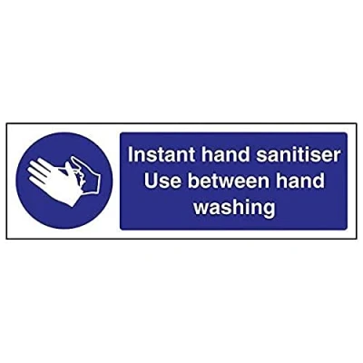 Helps to fulfil legal obligations to advise employees and visitors of specific actions and behaviour which must be adhered to in order to ensure personal safety as per Health and Safety (Safety Signs & Signals) Regulations 1996 Conforms to EN ISO 7010:2012 - Mandatory Signs feature a round symbol with a blue background of at least 50% of the total sign area, with a white pictogram and text Landscape Orientation. Sign reads "Instant Hand Sanitiser. Use Between Hand Washing" Highly durable Self Adhesive Vinyl material and screen printed message will stand the test of time Sign measures 300 x 100mm. Self Adhesive material will adhere securely to most surfaces