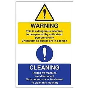 Helps to fulfil legal obligations to remind staff and visitors to wear the appropriate PPE in catering environments to ensure personal safety and maintain hygiene levels Conforms to EN ISO 7010:2012 - Mandatory Signs feature a round symbol with a blue background of at least 50% of the total sign area, with a white pictogram and text Portrait Orientation. Sign reads "Warning. This Is A Dangerous Machine. To Be Operated By Authorised Personnel Only. Check That All Guards Are In Position" Highly durable Self Adhesive Vinyl material and screen printed message will stand the test of time Sign measures 200 x 300mm. Self Adhesive material will adhere securely to most surfaces